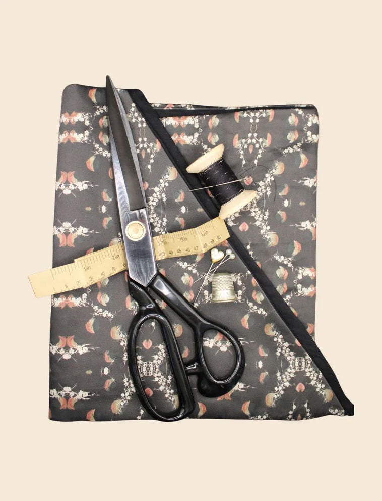 Every last stitch and detail of this dress has been fully considered to limit its impact on the environment through using 100% GOTS organic certified Natural fibre fabrics, digitally printed in London, natural fibre thread for construction, local manufacture of garments in London, labelling produced in West Wales onto natural fibre bases and fully sustainable packaging supplied and made in Sussex.